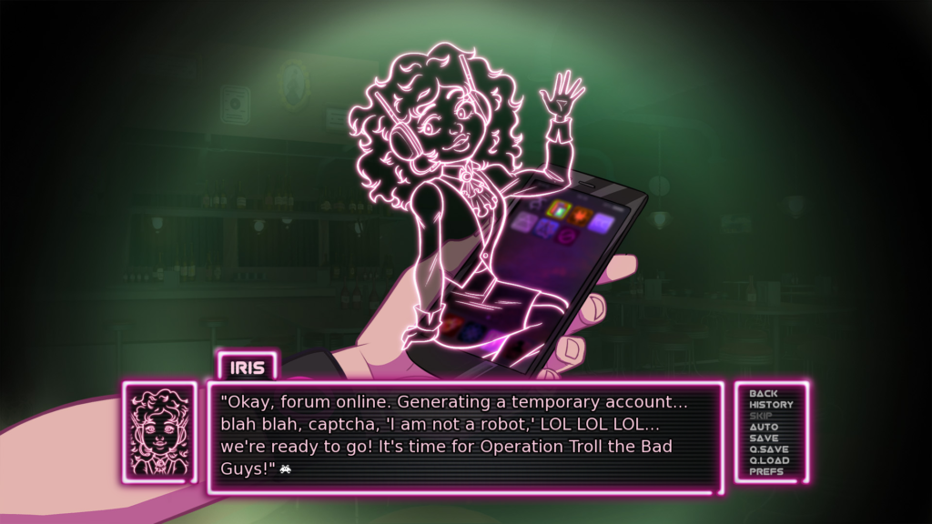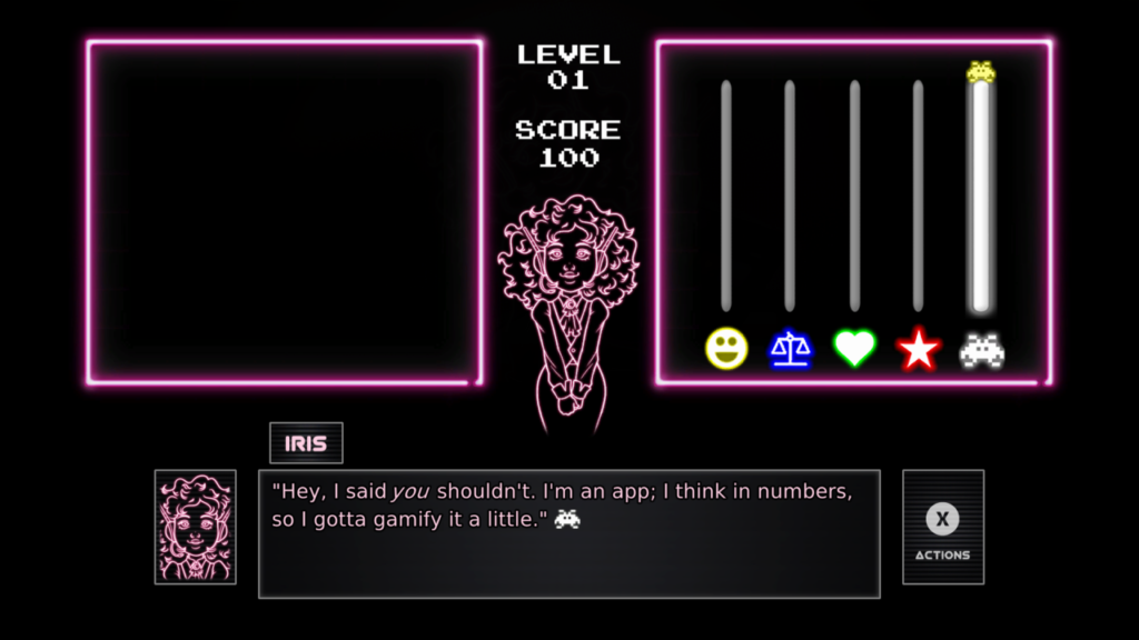 IRIS es un punto focal en el juego porque es quien nos introduce al funcionamiento de las opciones de diálogo. De ahora en adelante IRIS analizará cada elección que hagamos entre múltiples respuestas mientras interactuamos con los diferentes personajes. Cada opción estará vinculada a un rasgo de carácter específico (divertido, estable, amable, valiente o básico). Estos se muestran claramente mediante emojis, por lo que siempre sabremos qué tipo de respuesta daremos. Así, con cada elección que hagamos iremos desarrollando nuestra personalidad. Adicionalmente contamos con una opción en el breve tutorial de IRIS que nos permite ocultar los indicadores de carácter para que al elegir nuestras respuestas tengamos menos posibilidades de manipular nuestra personalidad.