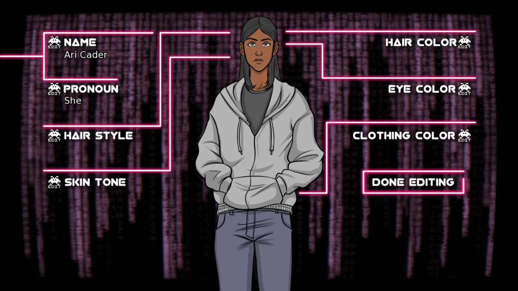 Lo segundo que haremos en Arcade Spirits es personalizar nuestro personaje de una manera rápida y sencilla. No hay opciones para elegir atuendos, podremos elegir entre tres estilos de cabello (corto, mediano o largo), también el color de piel, de cabello, y de ojos. Y finalmente nombramos a nuestro protagonista. Algo que llamó mi atención es que no podemos elegir el género sexual de nuestro personaje y de hecho tiene un aspecto bastante andrógino.