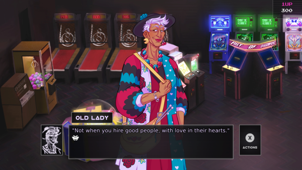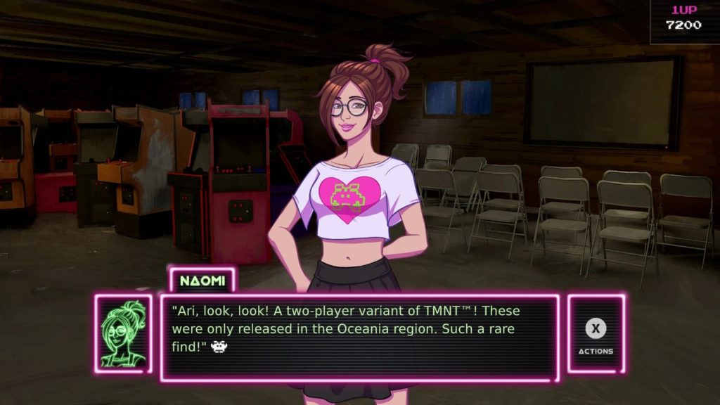 Visualmente Arcade Spirits es genial y se vale de mucha nostalgia para llamar nuestra atención. El aspecto en general te da la sensación de estar leyendo un comic clásico, con personajes muy originales y llenos de detalles. Tanto los personajes como los escenarios están parcialmente animados y son de calidad. Las expresiones de los personajes cambian según hablan. Por su parte los entornos también son muy cuidados, con muchos detalles y logran deleitarnos con las referencias al mundo arcade del que hace gala.