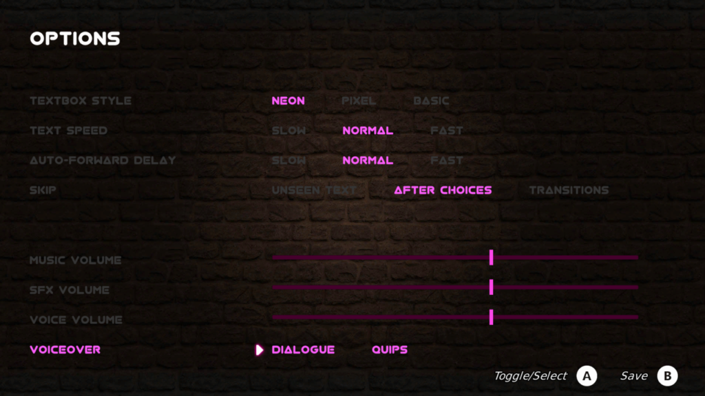 Lo primero que querrás hacer, como en todo juego es ir a ajustes para configurar las preferencias. Aquí nos encontramos con un menú muy reducido que solo nos permite configurar el aspecto del cuadro de diálogo, la velocidad y efectos del texto. También podemos regular el volumen de las voces, efectos y la música.