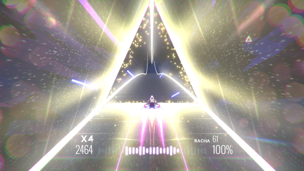 Las canciones que conforman el titulo de Hello There Games se componen de tres partes jugables muy diferenciadas. La primera de ellas es la más parecida a cualquier juego musical donde tenemos que pulsar un botón en el momento indicado, salvo por la novedad que deberemos desplazar nuestra nave de izquierda a derecha según vayan apareciendo los iconos. Esta parte no resulta muy difícil si ya estamos habituados a las propuestas musicales que inundaron nuestras consolas en la anterior generación. Lo interesante viene en la segunda parte, donde nos meteremos en una especie de túnel triangular y seremos capaces de movernos entre las tres paredes que conforman esta particular carretera. Por supuesto, esta parte es mucho más compleja y requiere de una visión espacial que iremos ganando a medida que vayamos entendiendo las mecánicas de AVICII Invector. Tranquilos, la tercera parte podríamos considerarla de “descanso”, ya que únicamente deberemos atravesar con nuestra nave ciertos círculos que se encuentran esparcidos por la pantalla, con un control absoluto del avión que nos permitirá anteponernos a los pocos peligros que vamos a presenciar.