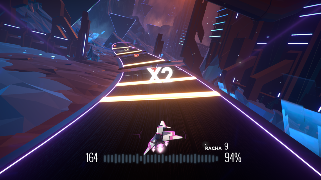 Existen tres niveles de dificultad que irán añadiendo complejidad y velocidad a las canciones. En cualquiera de los tres casos, comenzaremos con nuestra barra de aciertos al 100%, y según vayamos fallando notas, éste medidor irá descendiendo. Para completar con éxito un nivel, deberemos permanecer por encima de lo mínimo exigido, así que habrá que estar atentos para fallar lo menos posible. Cuando ya sepamos jugar y pillemos el ritmo a cada canción, tendremos otros objetivos en mente como conseguir una mejor puntuación. Para ello, aparte de no fallar ninguna nota (por supuesto), podremos poner en marcha un modo “turbo” que durante unos segundos aumentará la velocidad de nuestra nave de manera significativa, pero nos proporcionará una subida de marcador si realizamos bien las pulsaciones.