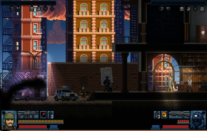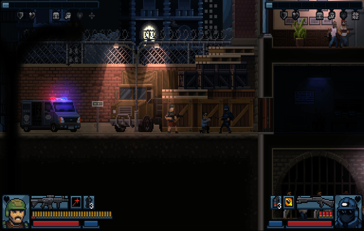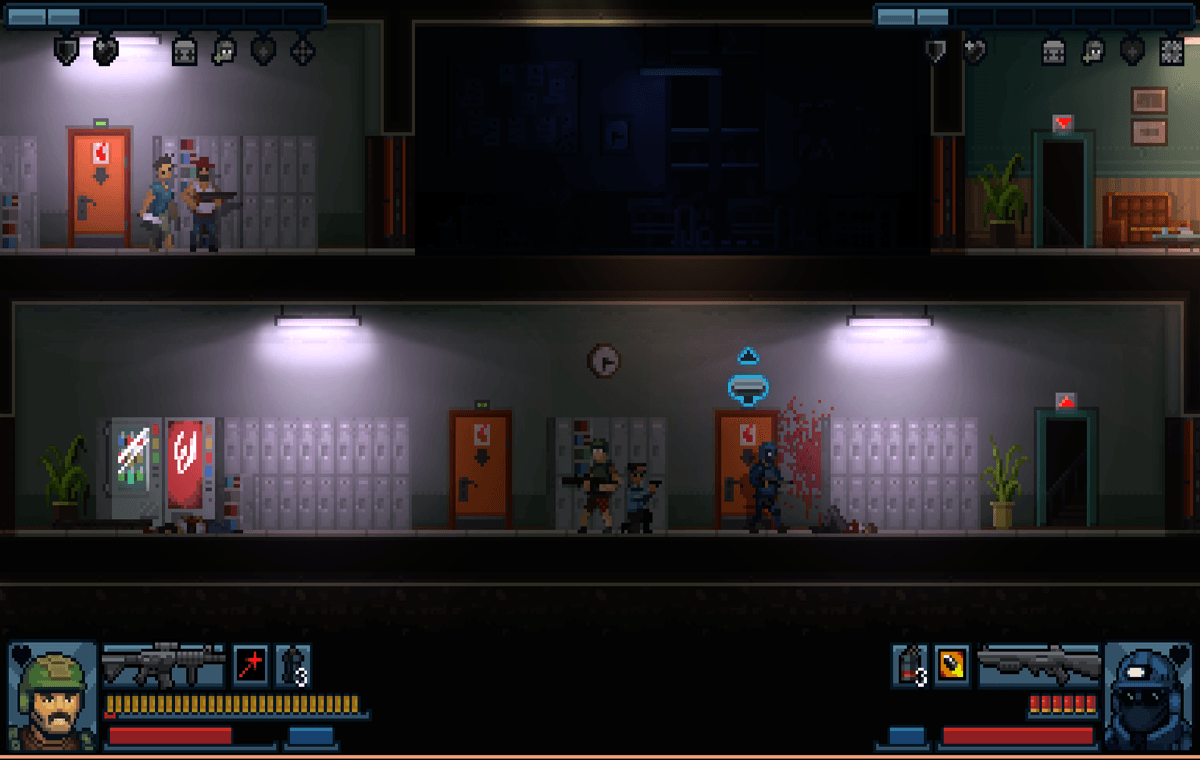 Aparte de poder seleccionar nuestra arma reglamentaria, chaleco y tipo de granadas, cada uno de los seis héroes tendrá un árbol de habilidades que iremos desbloqueando según obtengamos la experiencia requerida. Eso no se queda ahí, ya que en el transcurso de cada misión iremos llenando un medidor que nos permitirá usar ciertos objetos que harán nuestro periplo mas asequible. Según recarguemos esta barra, los objetos a utilizar serán cada vez mejores, empezando por un chaleco antibalas, siguiendo por cajas de suministros, botiquines, la reaparición de nuestro compañero de escuadra, una vida extra, hasta acabar con la habilidad especial que cada agente tiene. No son aspectos estratégicos muy profundos, Door Kickers: Action Squad es lo que es, aunque se agradecen estos momentos de planificación previa y aprovisionamiento antes de liarse a tiros contra todo lo que se mueva en pantalla.