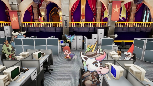 Escape From Ever After tiene mucho texto (traducido al Español neutro) que estaremos leyendo bastante rato, pero eso no quiere decir que no tenga una parte jugable excelente.  Se combinan a las mil maravillas con diálogos ágiles y para nada vacíos que animan a seguir explorando y hablar con todos. Cada personaje dentro de la empresa tiene una personalidad que la desarrolla a lo largo de la historia principal o en misiones secundarias, pero no sólo hablando con ellos sino participando en retos y puzles consecuentes con su evolución. Es un mundo vivo, capítulos de The Office con personajes de literatura infantil y no tanto. Nuestro propio equipo crece con personajes que ya hemos visto antes en algunos casos. La sinergia que hay entre el guión y la historia encaja como el puzle que es.