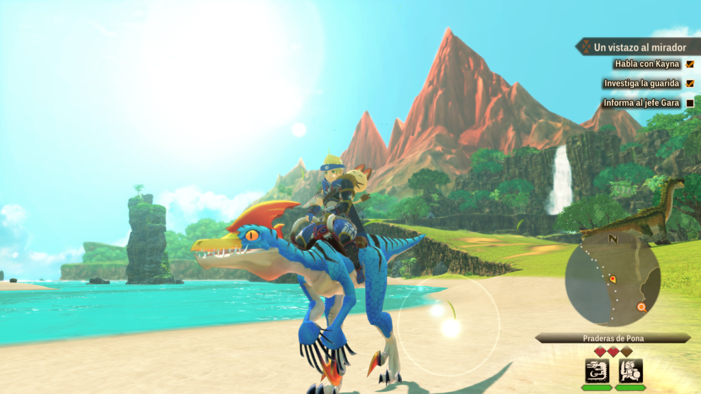 En el apartado jugable, Monster Hunter Stories 2 expande con acierto las bases de la primera entrega. Los mapeados ahora se estructuran por áreas amplias y bien conectadas, con mayor sensación de vida, más detalle ambiental y una exploración que, sin ser un mundo abierto, sí se acerca a un enfoque tipo sandbox muy agradecido. Recorremos valles, desiertos, selvas y cuevas a lomos de nuestros Monsties, accediendo a nuevas rutas según sus habilidades, encontrando secretos ocultos, nidos de monstruos y mazmorras que refuerzan la sensación de aventura constante.