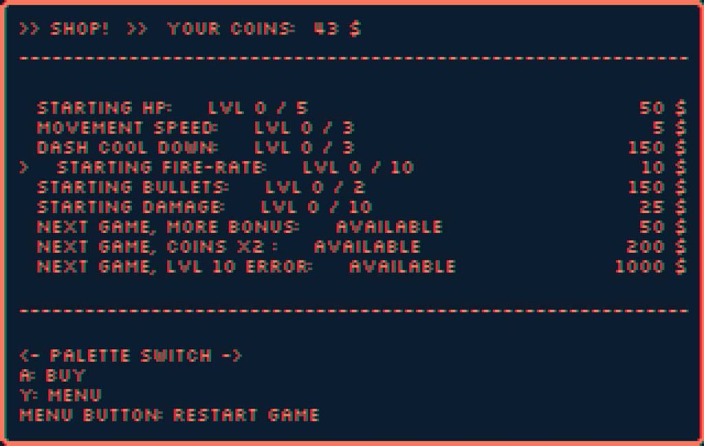 Hay un aspecto en Null Drifter que difiere de toda la esencia “retro” de la que hace gala, y se trata de la mejora de nuestra nave con cada partida. A medida que vayamos jugando, iremos recolectando monedas con las que luego podremos comprar potenciadores para nuestra nave (aumento de daño, mejora de vida, velocidad, tasa de disparo, recarga del dash, etc.). Esto nos obliga a jugar partida tras partida hasta desbloquear todas las mejoras posibles. Por suerte, no se hace aburrido, y ya sea porque vamos pillando el truco a los enemigos, o sea porque nuestra nave está mejor equipada, vamos a notar cómo con cada intento llegamos a una fase mas alta. Ojo, que los desarrolladores no son tontos, y según vayamos mejorando las capacidades de nuestro vehículo, así lo harán nuestros enemigos, siendo mas difíciles de matar y esquivar.