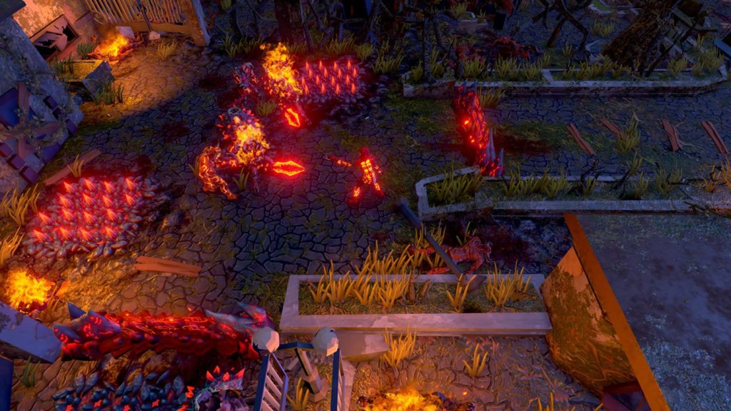La jugabilidad en sí es bastante clásica dentro de los “yo contra el barrio” en vista cenital de toda la vida. Avanzando por los distintos escenarios, que no tienen mucho recoveco que explorar más que algún pequeño callejón donde encontrar orbes e ítems, limpiaremos zonas de enemigos con la ya sabida fórmula de que el área se cierra y no se abre hasta que derrotemos las oleadas de criaturas.