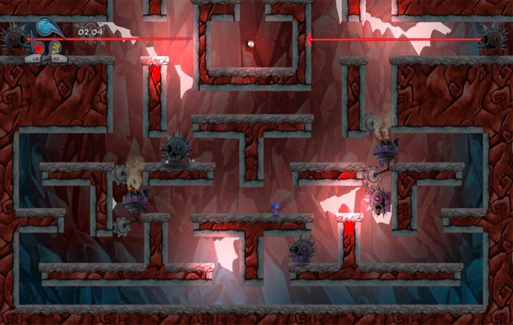 No solo habra que tener en cuenta la inercia del personaje y su movimiento (repito, si habéis jugado a Super Meat Boy o similares, sabréis de lo que hablo). Según vayamos avanzando por los mundos,  iremos adquiriendo poderes elementales que harán nuestro periplo mas complicado (sí, todo se convierte en una auténtica pesadilla). Con el poder de hielo, trueno y fuego, podremos crear y deshacer muros que nos faciliten las cosas… o nos las compliquen. El juego ni perdona, ni es benévolo. Si tiene oportunidad de fastidiarte con una trampa, lo hará. O una cabeza que te sople y empuje a los pinchos. O unos rayos láser que te amarguen la existencia. La vida es dura, y OkunoKA Madness lo es más.