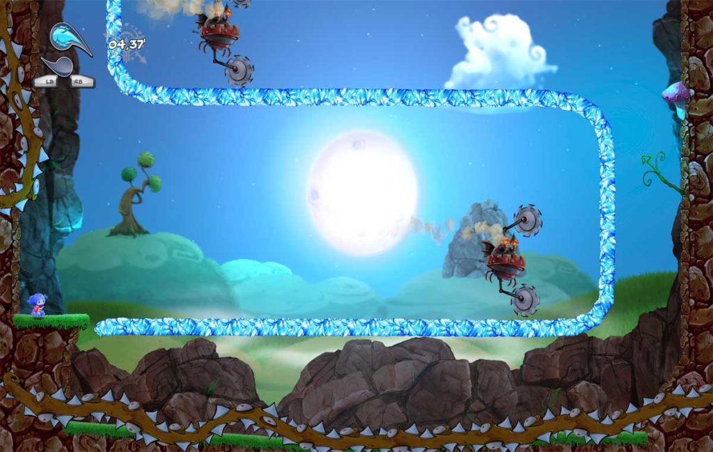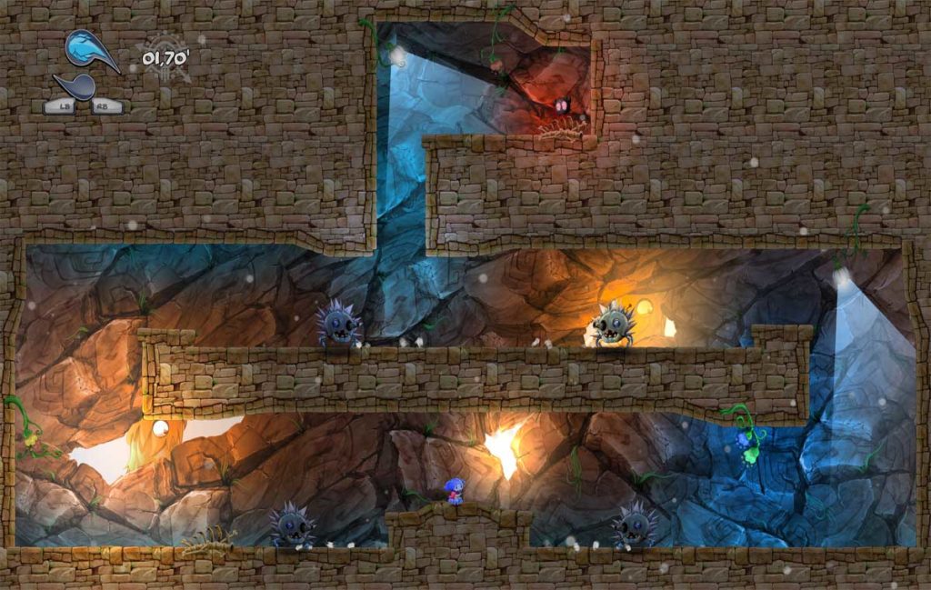 Que las fases duren apenas 30 segundos no quiere decir que sean “cuatro saltos sencillos y a por la siguiente pantalla”. Puede que al comienzo de la aventura tengamos esa sensación, pero os aseguro que según avancemos todo se irá tornando más complejo hasta alcanzar unos niveles demenciales. Ka se basará en su gran habilidad en el salto para sortear todo tipo de trampas y obstáculos hasta llegar al final del nivel, que finaliza cuando nos comemos una especia de pelusilla negra. Su jugabilidad me ha recordado mucho a títulos como Super Meat Boy, así que ya os podéis hacer una idea de lo que nos espera. Morir y morir hasta que conozcamos perfectamente las trampas de cada nivel y de esa forma poder superar lo que el juego nos tiene preparado.