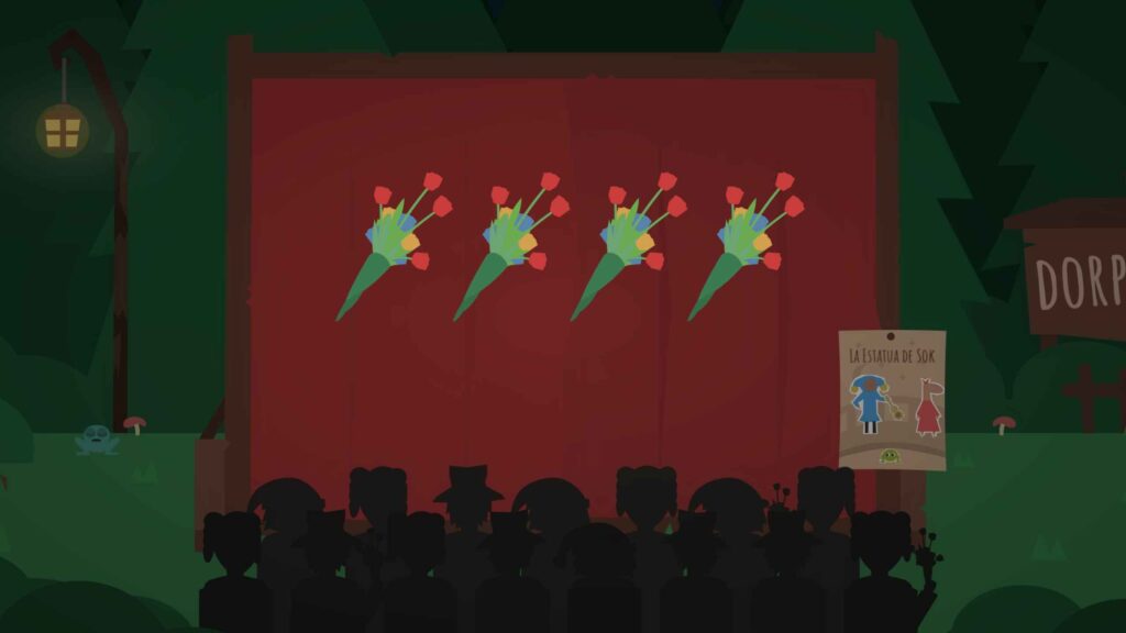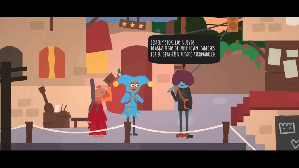 Lo que sigue es una gira teatral por cuatro regiones del reino, cada una con sus propios gustos, rarezas y exigencias. Desde una ciudad obsesionada con el drama hasta una aldea que solo quiere comedia absurda, Jester y Sok deben adaptar sus obras para conquistar corazones… y ramos de flores, que funcionan como puntuación artística.