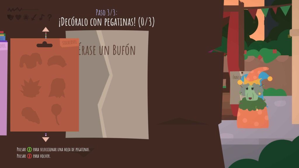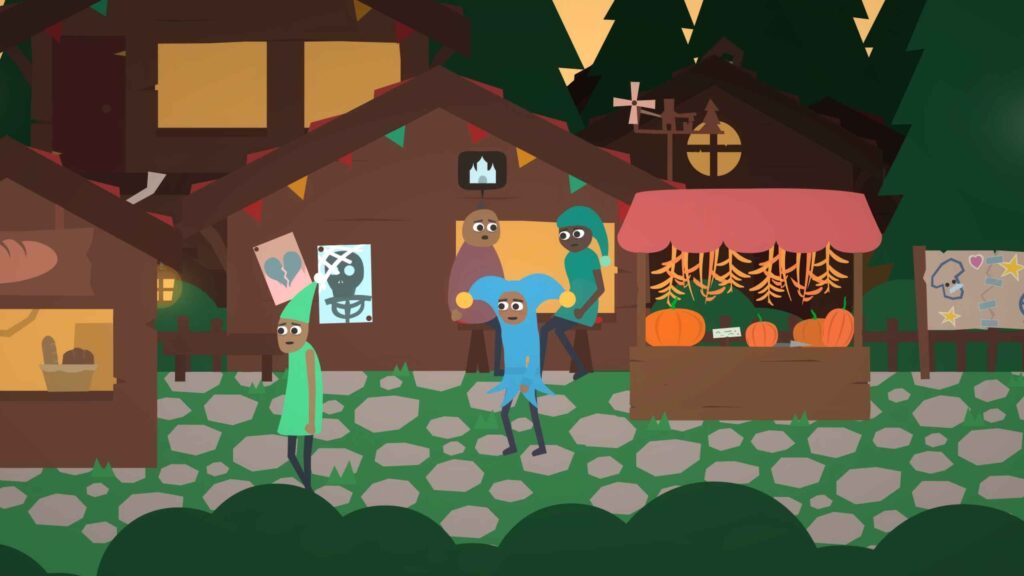 El estilo gráfico de Once Upon a Jester es minimalista, casi infantil, pero con una coherencia estética que refuerza el tono del juego. Los personajes parecen recortes de papel animados, los escenarios son como telones pintados, y los efectos visuales recuerdan a un teatro escolar. Pero lejos de ser una limitación, esto potencia la sensación de estar dentro de una obra improvisada.