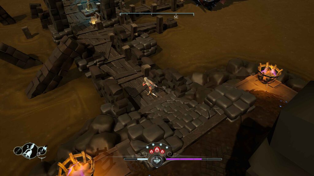 Las ciudades hundidas, templos y ruinas transmiten una sensación constante de mundo moribundo, similar a la decadencia ambiental de Dark Souls, pero reinterpretada desde una perspectiva más luminosa y desértica. El modelado de personajes y enemigos no busca hiperrealismo, sino siluetas claras y legibles, lo que favorece el combate. En cuanto al audio, el juego destaca especialmente: la banda sonora es atmosférica, emotiva y muy bien integrada en la exploración, con temas que refuerzan la soledad del viaje y otros más intensos para los combates. Los efectos de sonido —desde el crujido de las maderas hasta el impacto de las armas— están cuidados y aportan una inmersión notable, demostrando un trabajo sonoro por encima de la media dentro del panorama indie.