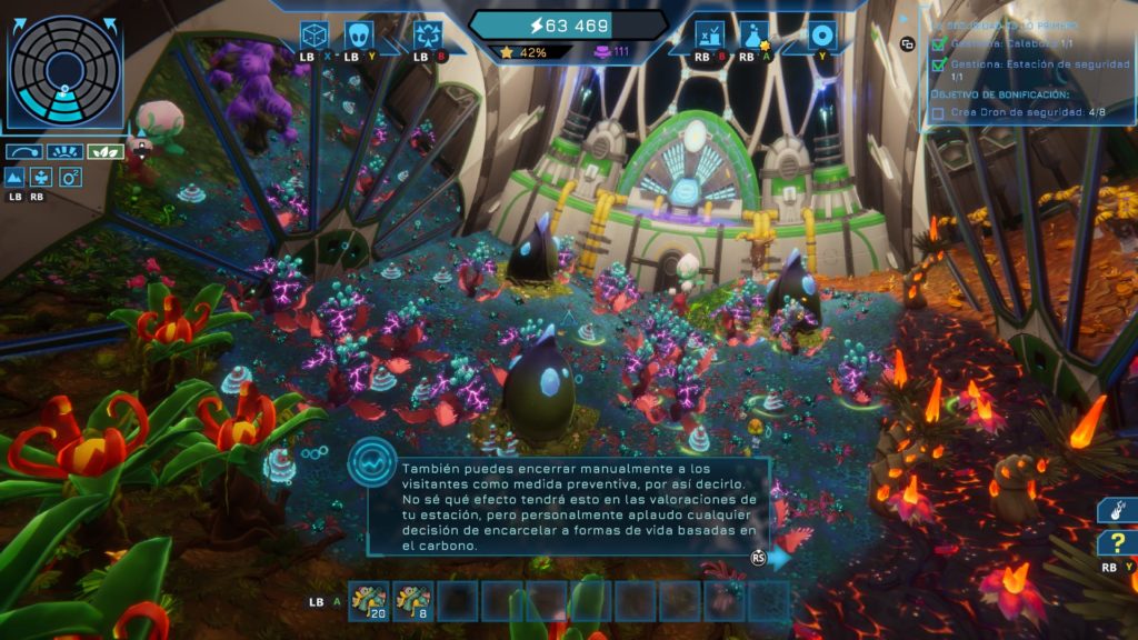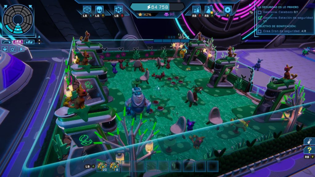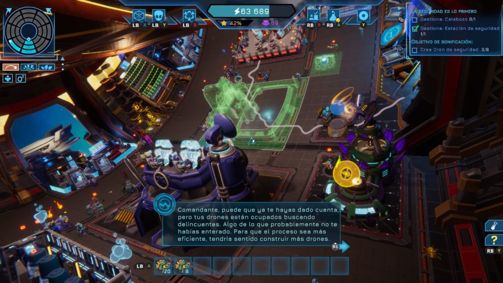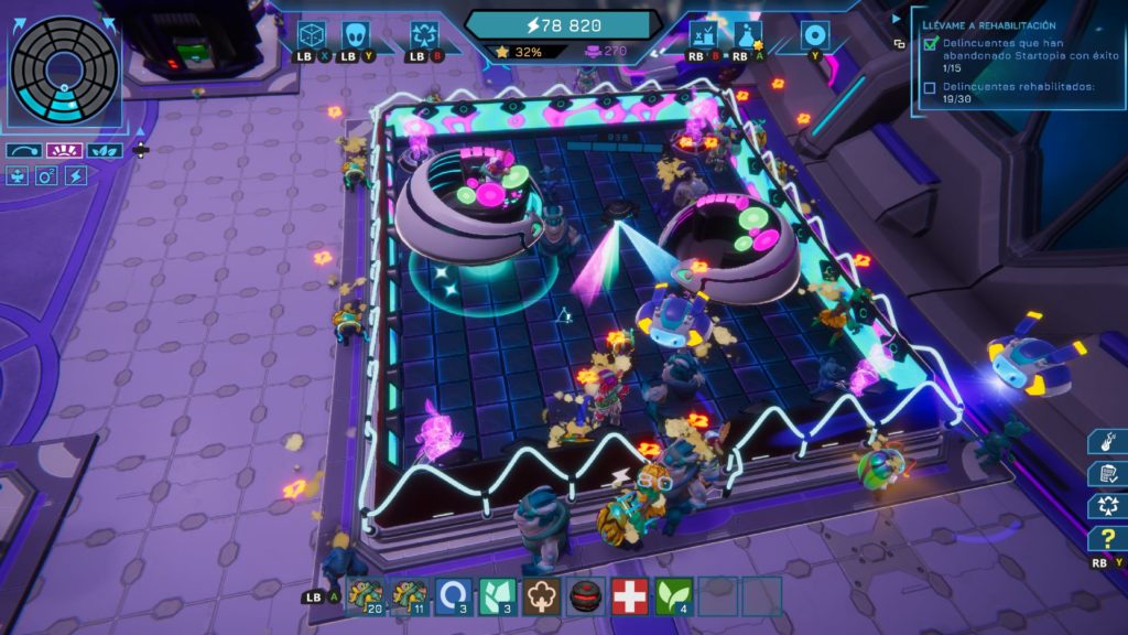 Cada menú y submenú se abre con una combinación de botones distinta (RB+A, RB+B, RB+X, LB+Y, etc.), lo cuál lo hace bastante incómodo y aún habiéndonos acostumbrado a ella, deberemos lidiar con la ardua tarea de movernos con el cursor sobre la pantalla a través del stick del mando. Por pura curiosidad, vi un par de gameplays en su versión en PC de diferentes creadores de contenido y la diferencia era abismal. Así que se me antoja bastante complicado recomendar la versión para consolas de Spacebase Startopia.