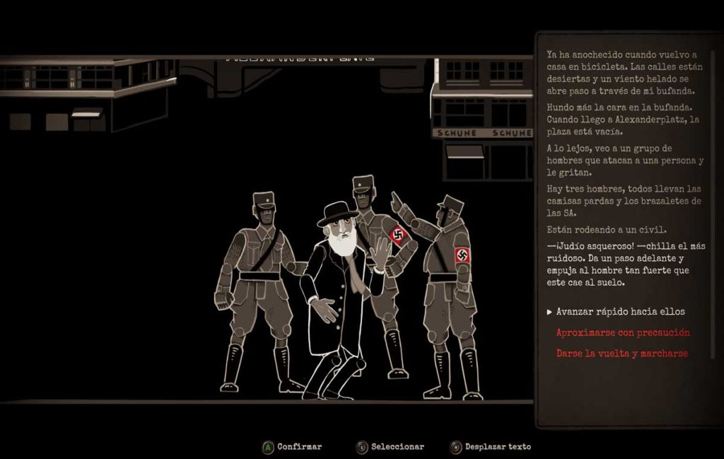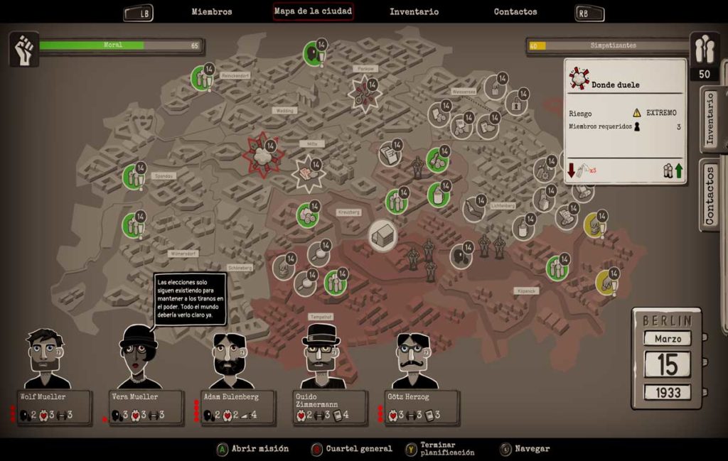 Aunque es innegable el factor estratégico que destila Through the Darkest Times, tampoco os asustéis mucho. Las acciones son muy fáciles de entender, todo está muy bien expuesto en la pantalla para que no te pierdas y los controles son sencillísimos (con dos botones haremos todo). Cuando hay diálogos entre nuestros simpatizantes (o riñas, que también hay unas cuantas) te indicarán quiénes son para que no te pierdas, e incluso para que consultes sus estadísticas por si tienes que prescindir de alguno de ellos. Conversaciones, por cierto, muy bien traducidas al español y hacen que el título gane muchos enteros. Hay decisiones complejas, y más vale que no perdamos hilo de lo que sucede cada día que pasa.