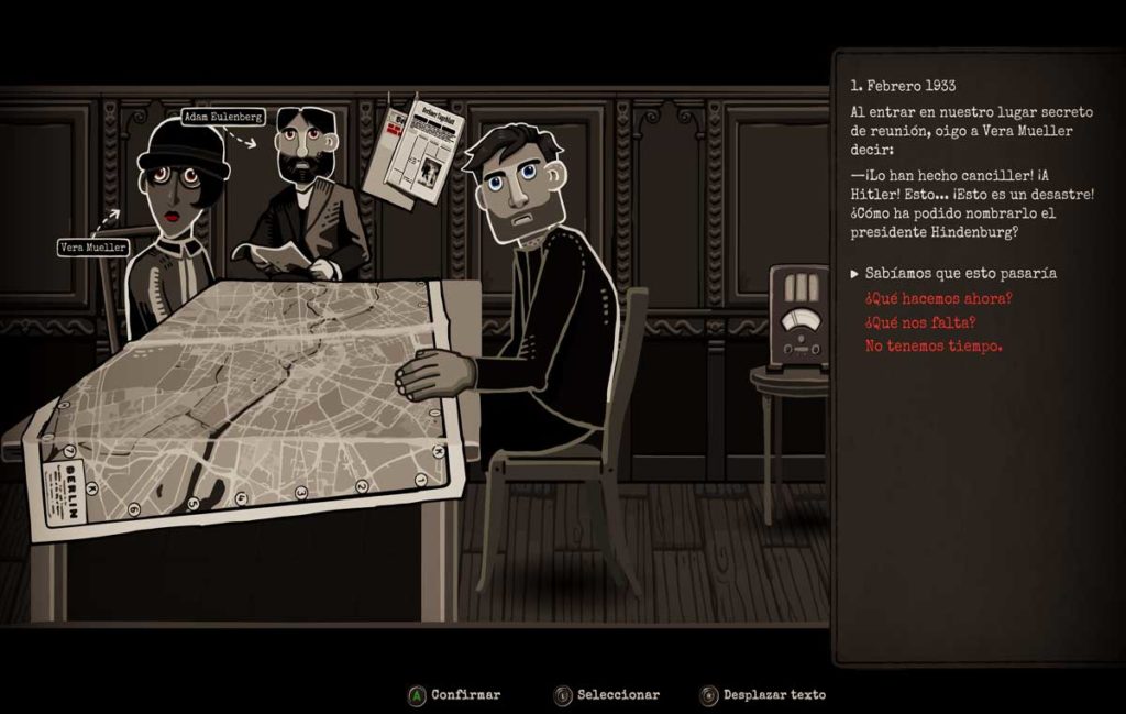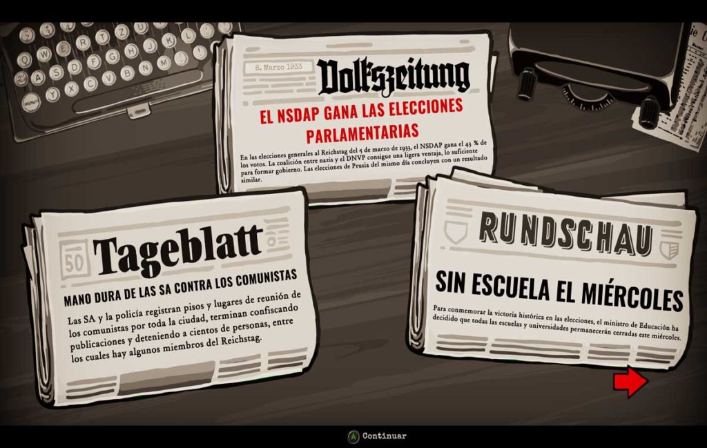 Hay un elemento que me ha gustado mucho, y es el factor histórico que posee el juego. No me atrevo a decir todos, pero muchos de los eventos que suceden en el título pasaron de verdad en la vida real. Nada más empezar el turno, podemos leer periódicos que nos informarán de los hechos más relevantes que van sucediendo en Berlín. Me resulta interesante ver cómo fue la escalada hacia el poder que tuvo Hitler, y cómo fue dejando en la cuneta al resto de opositores para desmarcarse con la dictadura que conocemos. Incluso otros eventos históricos como el incendio del parlamento Reichstag está muy bien recreado, con posibilidad de acceder a una especie de diálogo con varias respuestas disponibles que pueden condicionar nuestra partida.