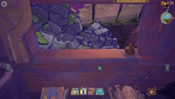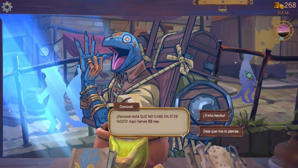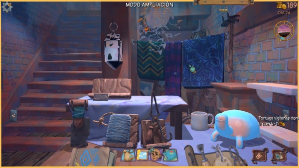 ¿Qué hacemos con lo ganado en nuestras transacciones? Pues lo único que se le ocurre a un tiburón de los negocios: mejorar nuestro activos. Nuestro enlace con Aimón está aquí y podremos mejorar nuestras herramientas o adquirir otras para ampliar nuestro inventario o mejorar nuestra calidad de vida. Esto, en cierto punto del juego es extensible a cada pared. Pudiendo poner más estanterías, sobre todo esto. Llega un punto que estarás de cachivaches tan hasta arriba que una balda más es necesaria para almacenar. Porque lo importante es picar en los sacos para lo que te puedan pedir, almacenar y cuando sea necesario limpiar.