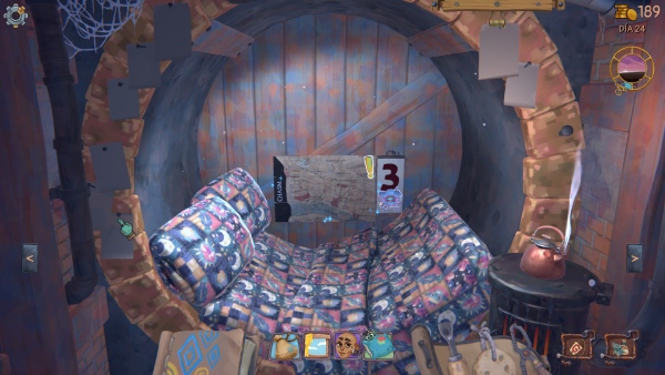 Una vez superada la diversión y metidos en el tedio laboral, hay otra capa que es la de gestionar el tiempo. Aquí tenemos que decidir cuidadosamente si sacar más material o limpiar el que ya tenemos. Porque hay gente a la que le da igual si está limpia una baratija pero otros la exigen reluciente. Cada tarea tiene un coste temporal y cuando se agota no podemos hacer otra cosa que irnos a dormir. El Dormitorio: otra de las 4 paredes de nuestro hogar. Aquí poco podemos hacer excepto decorarlo un poco más adelante con unas mejoras de las que se adquieren en la última de las paredes de esta casa.