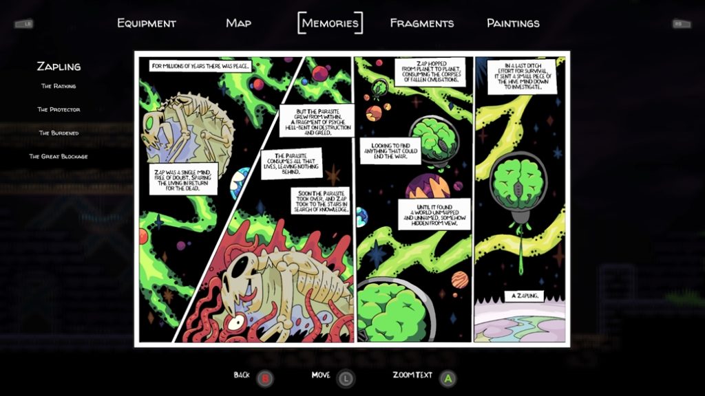 Como pequeño fragmento de este organismo que somos, no tenemos piernas ni capacidad de muchas cosas. Somos un simple moco verde que se arrastra sin otra pretensión. Pero de repente toparemos con un viejo cráneo de un cadáver abandonado, que usaremos a modo máscara… y que al equipárnoslos nos dotará de las primeras habilidades útiles, unos tentáculos que nos permitirán andar y explorar el mundo al que nos arroja Zapling Bygone.