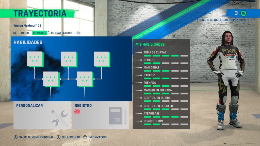 Una vez creado nuestro avatar y aprendido las nociones básicas del juego, es hora de comenzar nuestra carrera deportiva. El modo Trayectoria será dónde podremos empezar nuestra leyenda desde sus cimientos. Primero de todo deberemos iniciarnos en la clase Futures, seleccionando nuestro fabricante y compitiendo por primera vez en nuestra corta vida de pilotos. A lo largo de cada semana podremos realizar un entrenamiento con el que mejorar las habilidades de conducción. Tras finalizar esta primera etapa pasaremos al modo Rookie, dónde firmaremos nuestro primer contrato con un nuevo fabricante y patrocinador. Los cuáles nos aportarán bonificaciones de dinero dependiendo en qué posición acabemos cada carrera. Si conseguimos acabar en el podio de la modalidad Rookie, ascenderemos al modo Pro, dónde nos codearemos con los mejores pilotos del circuito y que supone un reto de una mayor dificultad.