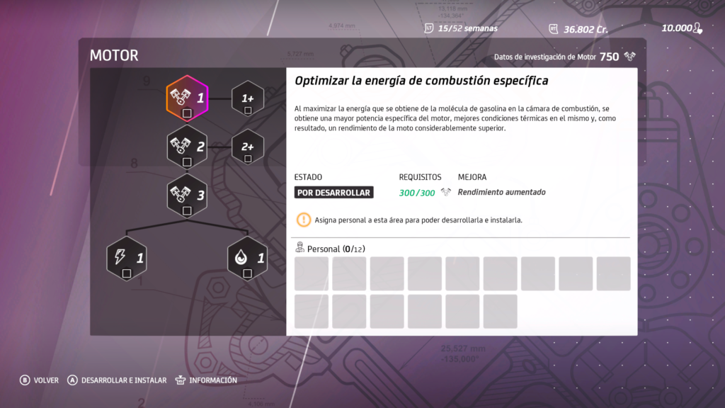 Una vez ajustada la dificultad, es hora de mejorar nuestro vehículo. Gracias a un sistema de investigación y desarrollo, asignaremos miembros del equipo a investigar y mejorar las diferentes partes de la moto. Desde electrónica a aerodinámica; sin olvidar el motor o los frenos, todo tipo de avances se pueden ir desbloqueando. Como si de un equipo real que busca perfeccionar su moto se tratase, iremos jugando al científico loco invirtiendo presupuesto y semanas del año en mejorar cada cosa. Es importante buscar las mejoras más útiles según nuestro estilo.