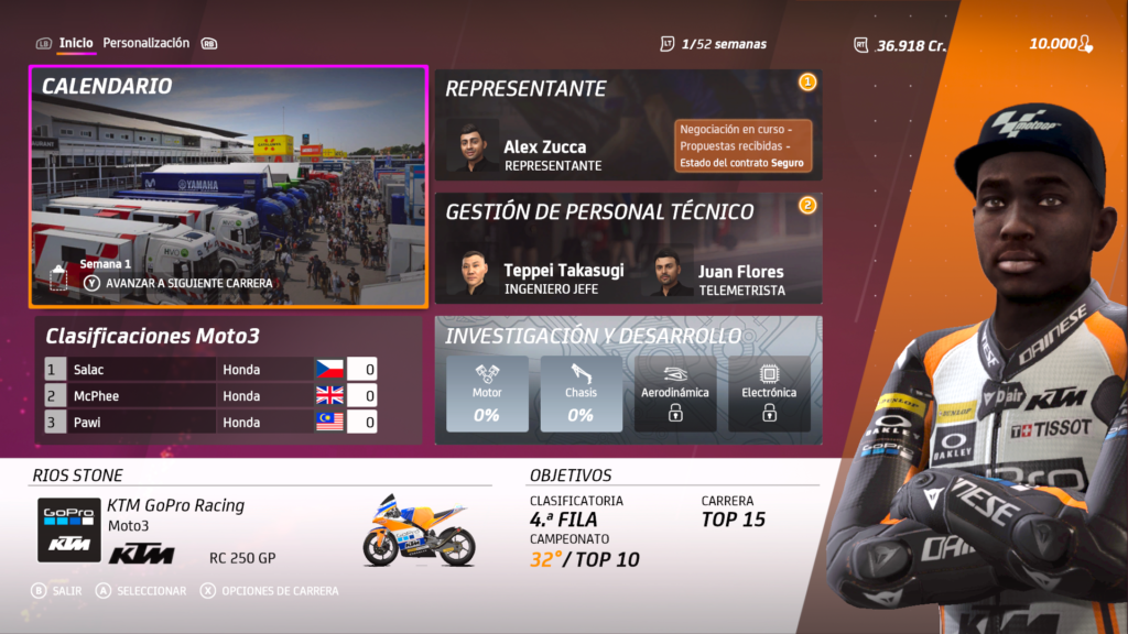 No todo es poner pegatinas y pintar la moto, la trayectoria personal implica mucha gestión y decisiones. Como sabréis, ser piloto de MotoGP no es arrancar el motor y tirar millas, no, más bien necesita presupuesto y renombre. Esta parte está bastante bien simulada con un gestor de calendario y eventos acompañado de menús para otras decisiones. Desde captar mecánicos hasta tener el mejor agente, debemos ser sensatos al buscar miembros para nuestro equipo sin arruinarnos por el camino.
