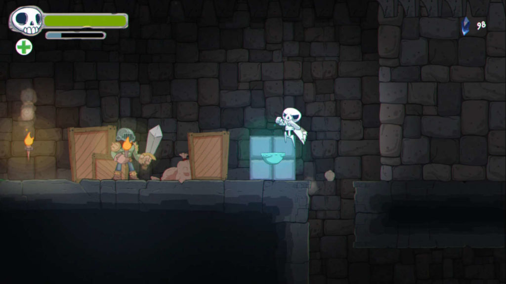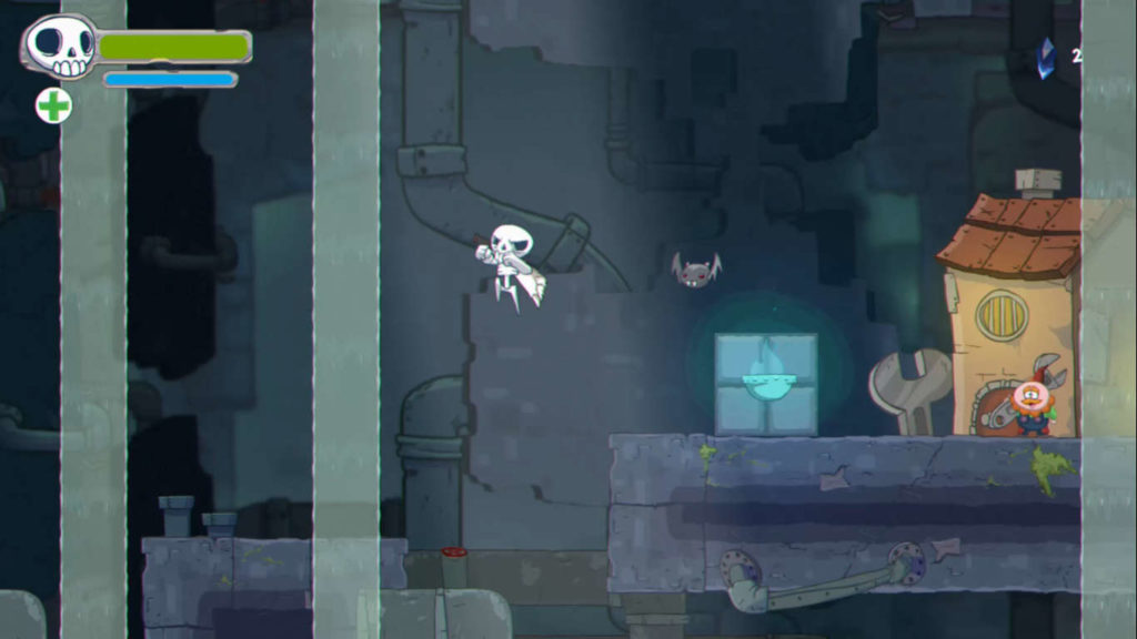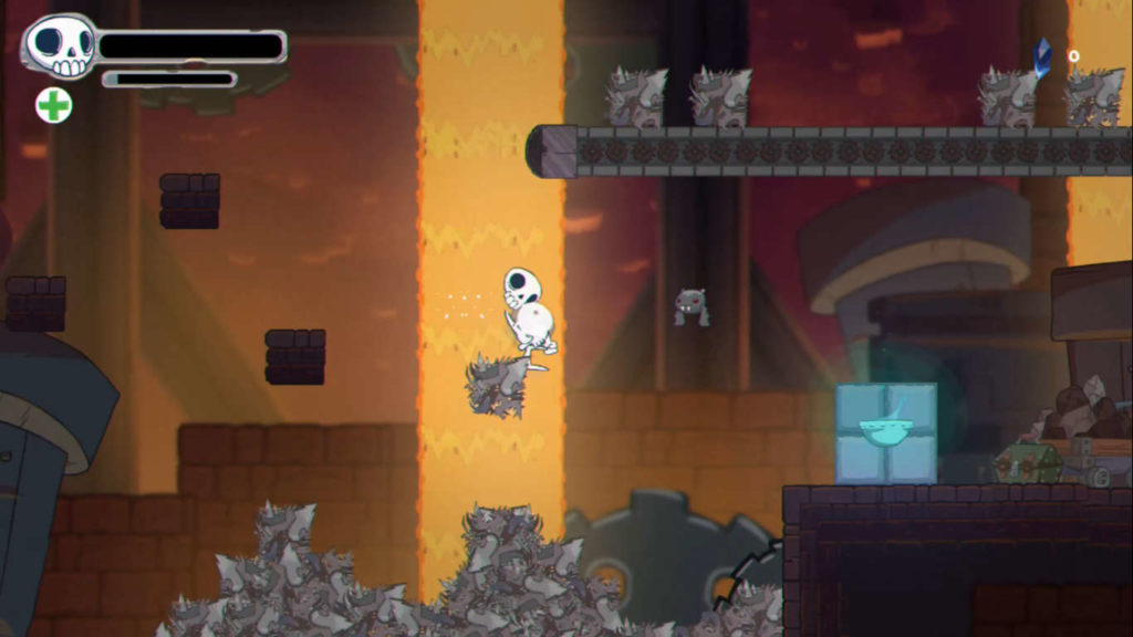 Vamos con la jugabilidad de Skelattack que es donde está mucha parte de la chicha de este título. Skully puede saltar, golpear con su espada y agarrarse levemente a las paredes para así impulsarte y es esta la que más explota el juego sin ninguna duda. Estamos ante un metroidvania que tiene el mapa más reducido de lo normal pero que, en su escala, es interesante como aprovecha cada uno de los rincones. Todo es accesible, por supuesto, pero no para es apto para todo el mundo. Con esto quiero decir que, si te la juegas puede que mueras un montón de veces y te toque repetir la sección pero que, si consigues dominar el pequeño puzzle de plataformas te sentirás como un maestro del mando.