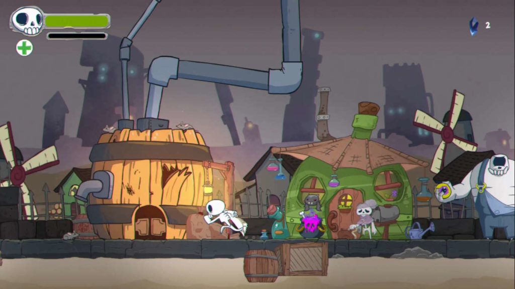 Ahora hablemos del apartado técnico de Skelattack porque es su punto fuerte. Gráficamente es super simpático, es algo fuera de lo normal. Muy divertido tanto de jugar como de ver, con unos diseños muy interesantes y cuidados. Llaman la atención los gestos de Skully e Imber que están muy logrados y son expresivos hasta decir basta. Los entornos están también muy conseguidos y da la sensación de estar jugando en un cómic. Pero la parte gráfica no impactaría ni la mitad de lo que lo hace si no fuese por una banda sonora absolutamente maravillosa que te mete de lleno en toda situación con melodías pegadizas y temas muy trabajados. Aquí os dejo mi favorita: