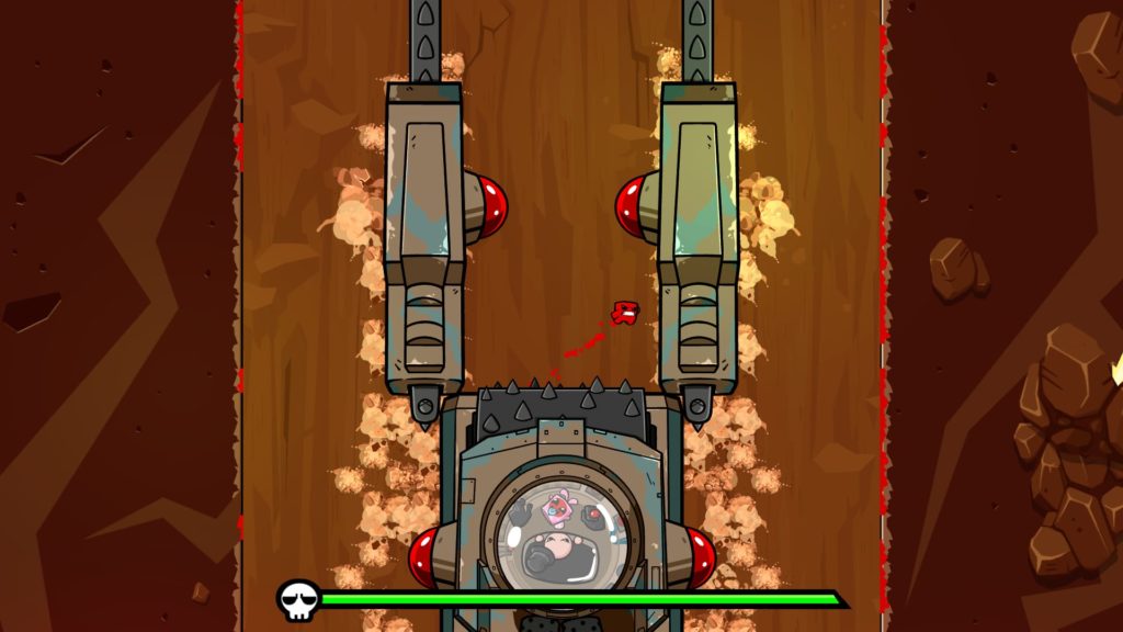 Después de superar las 6 fases que componen cada “mundo”, tocará el momento de enfrentarnos a los jefes finales de Super Meat Boy Forever. El diseño de los jefes está totalmente centrado en el combate, aunque sin dejar de lado las plataformas y el frenesí de esquivar obstáculos mortales en pantalla. Cómo si de un juego Souls se tratase, los jefes irán cambiando sus patrones de ataque a medida que vayamos reduciendo su barra de salud.