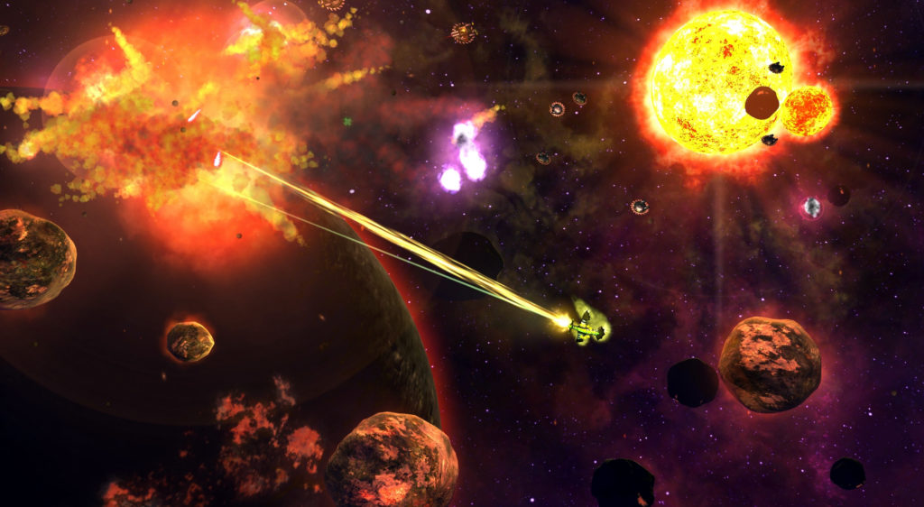 • Sobrevive a los peligros del hostil entorno espacial tales como los asteroides, campos de minas, y nubes radiactivas. Puedes también utilizarlos en contra de tus enemigos.