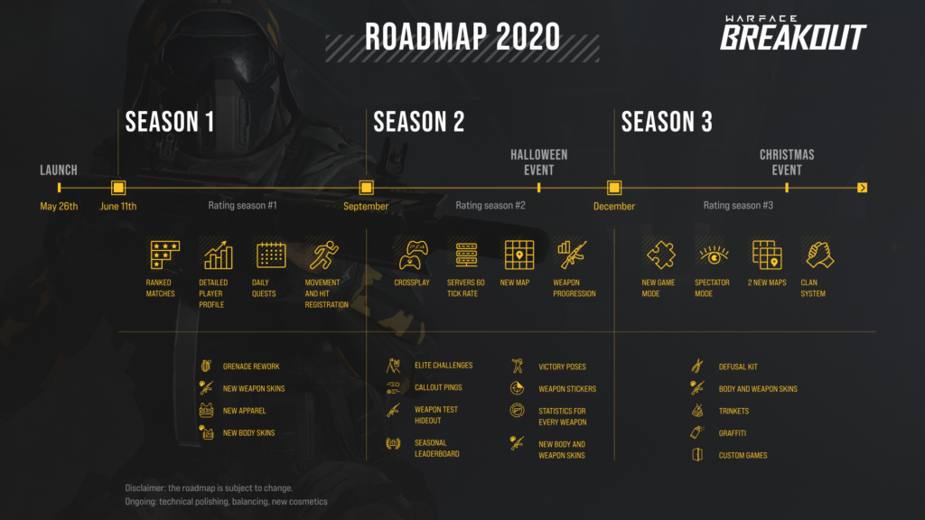 De momento, en este 2020 veremos cómo los desarrolladores MY.GAMES y Allods Team van añadiendo todo tipo de elementos cosméticos para personalizar a nuestros soldados, aparte de contar con el nuevo mapa antes citado. Como novedad, podremos ver nuestro progreso en Warface: Breakout e incluso el desbloqueo de estos elementos cosméticos en una tabla adaptada para ese fin.
