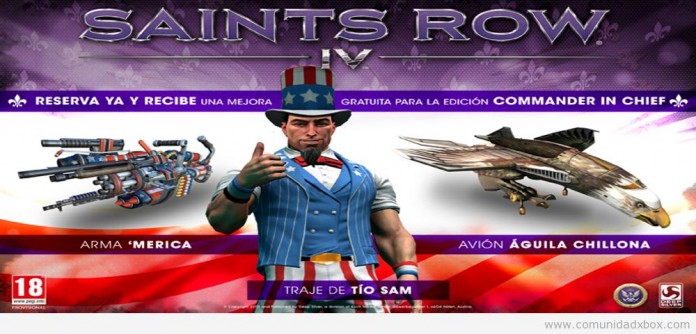 Pero los líderes del mundo libre sufren el ataque de una invasión extraterrestre en la “tierra de la libertad”, así que tú y tu banda tendréis que salvar el mundo, al estilo Saints. Para ayudarte a combatir a los terroristas extraterrestres que encontrarás, la edición Commander in Chief es una mejora gratuita para todas las reservas realizadas en los establecimientos participantes y viene cargada hasta los topes con un águila chillona que dispara cohetes por sus garras y que puede invocar el ataque “grito sónico”, que dejará a tus enemigos confundidos, anonadados y probablemente traumatizados de por vida.