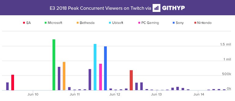 Pues bien y tal como nos revelan desde GitHyp el mayor número de jugadores a través de Twitch se concentró en torno a la conferencia de Xbox, coronándose así no solo como la conferencia más vista de este E3 2018, sino que también como el evento en directo más visto en la historia de Twitch.