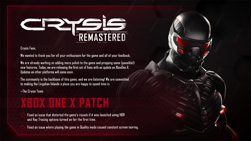 Fans de Crysis: Queremos agradecer a todos el entusiasmo por la llegada del juego y por el feedback recibido. Estamos trabajando en este momento en pulir aspectos del juegos, y añadir nuevas características al juego si sale todo bien. Hoy mismo lanzamos el primer pack de reparación de errores para una actualización en Xbox One X. Las actualizaciones para las demás plataformas llegarán más adelante“, informa Crytek.