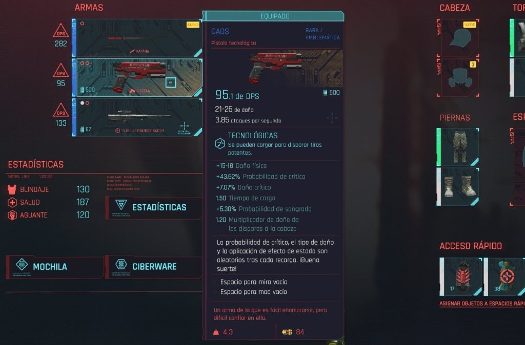 La pistola “Caos” tiene una peculiaridad que no debéis pasar por alto, y es que cada vez que recargueis el arma cambiarán sus propiedades. Por ejemplo, puede tener daño eléctrico y que al recargar cambie a daño químico. Además, al igual que la chaqueta, en Cyberpunk 2077 podréis mejorar vuestras armas obstensiblemente, convirtiéndolas en una de vuestras mejores amigas para cualquier refriega.