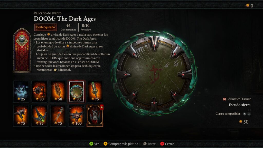 Uno de los grandes protagonistas de esta actualización es el crossover entre Diablo IV y DOOM: The Dark Ages, que llega como parte de la temporada y añade cosméticos inspirados en el universo del Doom Slayer. A través de un relicario especial del evento, los jugadores podrán desbloquear diferentes recompensas estéticas basadas en la saga DOOM. Entre ellas destacan elementos como un escudo sierra, un mangual inspirado en el Slayer, trofeos de espalda y otros cosméticos temáticos.