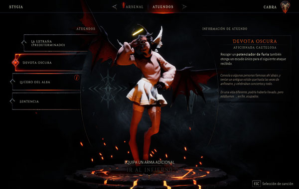 No son las únicas novedades que encontraremos. La Extraña también cambiará su look para esta nueva incursión. Tendremos tres skins diferentes, cada una con atributos y potenciadores distintos que nos beneficiarán según nuestro estilo de juego. Como Devota Oscura, nuestro potenciador de furia nos otorgará un escudo único. Cuando nos vestimos como el Lucero del Alba, el potenciador de furia nos restaurará poco a poco la salud. Y por último, si escogemos el outfit Sentencia, la recarga rápida óptima hará aumentar la munición máxima que podamos llevar. Por mi parte escogí sobre todo el segundo atuendo, ya que me hacía gracia recorrer el Infierno con un jersey de cuello vuelto.