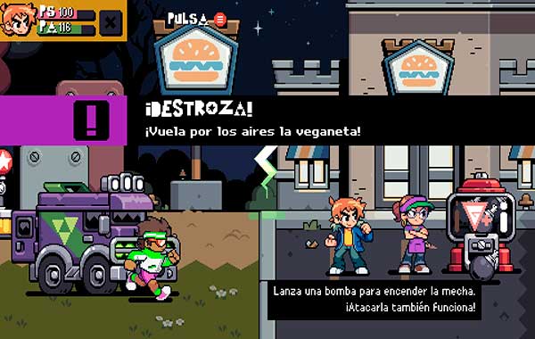 Esa libertad no valdría de nada si no tuviéramos ese instinto de buscar la siguiente sorpresa. En cada fase, siempre hay algo que da la nota, y eso me encanta. Que si veganos musculosos con pelotas de playa, robots, deportistas con muy malas pulgas… Sin contar con la magia de Scott Pilgrim, que son sus referencias a otros videojuegos. Si empiezo no paro: la armadura de Sir Arthur de Ghost´n Goblins, los rábanos que arrancábamos del suelo en Super Mario 2, las conchas verdes que podremos lanzar y que rebotan, las plantas piraña…Es un no parar.