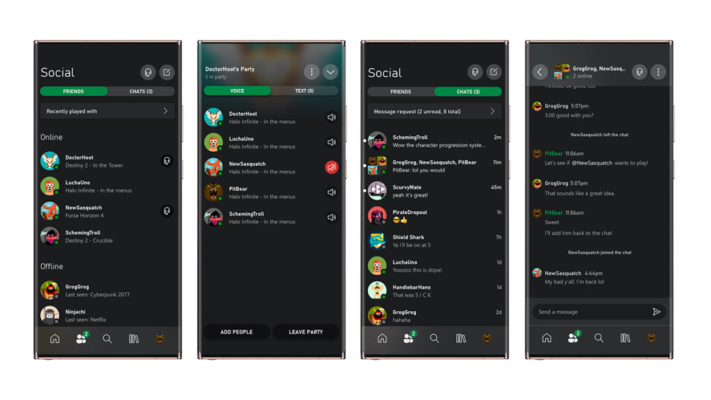 Como podíamos hacer antes, podremos comunicarnos directamente con nuestros colegas para jugar a través del móvil. Será posible iniciar una conversación o unirse a ella. También podremos conectar nuestros auriculares al móvil y hablar con los jugadores que estén jugando en sus consolas Xbox One o Xbox Series X/S.