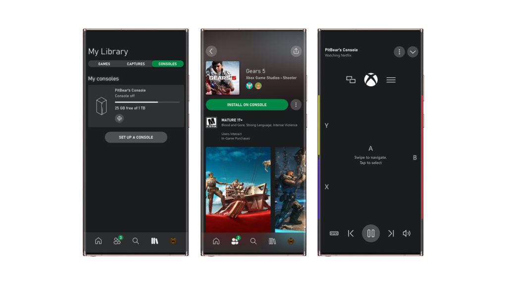 Visualmente, la aplicación utiliza los códigos ya establecidos en la aplicación de Xbox Game Pass y la interfaz de Xbox One/Xbox Series X/S. Esto ha sido pensado para que la aplicación sea mucho más sencilla de lo que era antes y por ende más accesible. En la barra de menú tendremos las opciones de juego en curso, amigos conectados, recomendaciones, la lista de amigos, una función de búsqueda, la biblioteca de capturas, así como la función de streaming, y finalmente los ajustes de la cuenta.