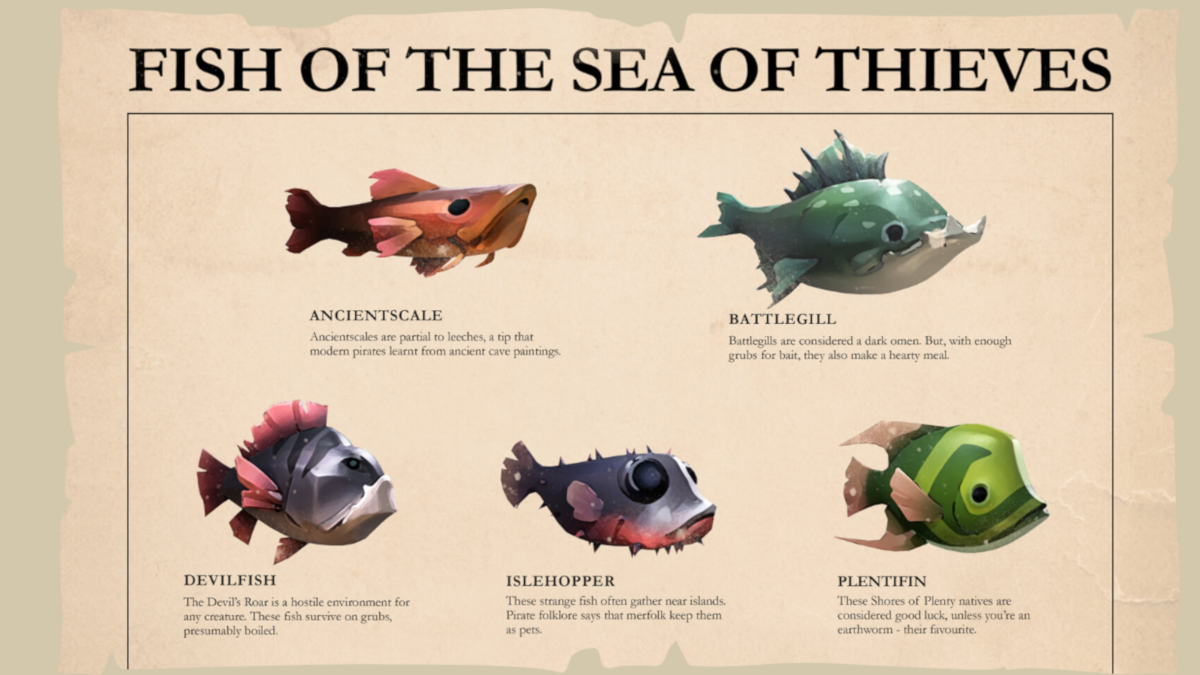 11. En el mar de ladrones hay diez tipos de pescado diferentes. Cada uno de estos tiene cinco variaciones. Entre versiones de colores varios, como ciertos monstruos de bolsillo, y otras que brillan en la oscuridad(esto empieza a parecer un anuncio de Giochi Preziosi), deberemos surcar los mares en todas su zonas y probar a diferentes horas del día para hacernos con todos. Por favor, no tratéis de pescar un megalodón con una caña, podría haber complicaciones.
