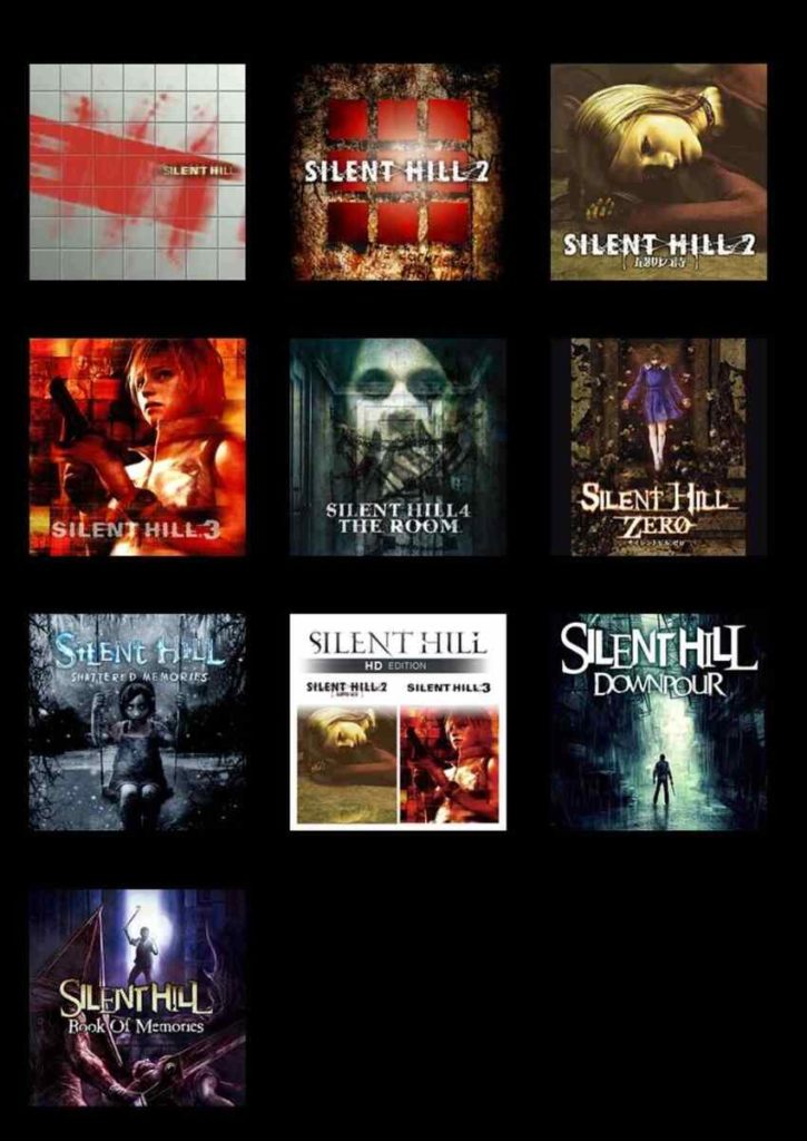 Podemos pinchar sobre cada uno de los 10 títulos, se nos ofrecerá una breve descripción y como obtenerlos. Estos diez títulos son: Silent Hill, Silent Hill 2, Silent Hill Director’s Cut, Silent Hill 3, Silent Hill 4: The Room, la edición en HD de SH2 y SH3, y los capítulos Origins, Shattered Memories, Downpour y Book of Memories.