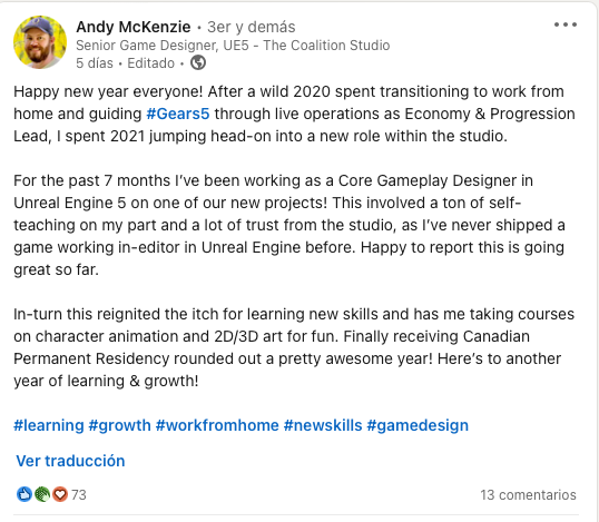 “¡Feliz Año Nuevo a todos! Tras un 2020 de locura en el que pasé a trabajar desde casa y a liderar las operaciones de Gears 5 como Jefe de Economía y Progreso, he pasado el 2021 asumiendo un nuevo papel dentro del estudio.